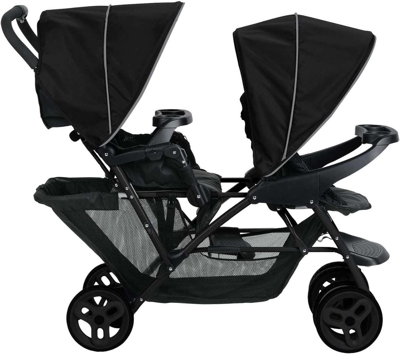 Go on a family adventure with the Graco Stadium Duo Click Connect double stroller. This double stroller combines comfort and functionality, and incorporates all the essential features for a growing family. It accommodates two Graco Click Connect car seats for toddlers that can be easily attached to the frame of the tandem stroller with just one click. Thanks to a smart one-handed fold, easily carry it on your family trips. The stroller is also self-supporting when folded. The Stadium Duo can carry 2 children up to 3 years old (or 15 kg). The two-level seating configuration allows the child in the back to be slightly elevated to better see everything around him. To preserve the comfort and ease of your little ones, the two seats have several reclining positions, a tray per child with two cup holders, an extendable hood and a step. The extra large storage basket provides parents with plenty of easily accessible space.